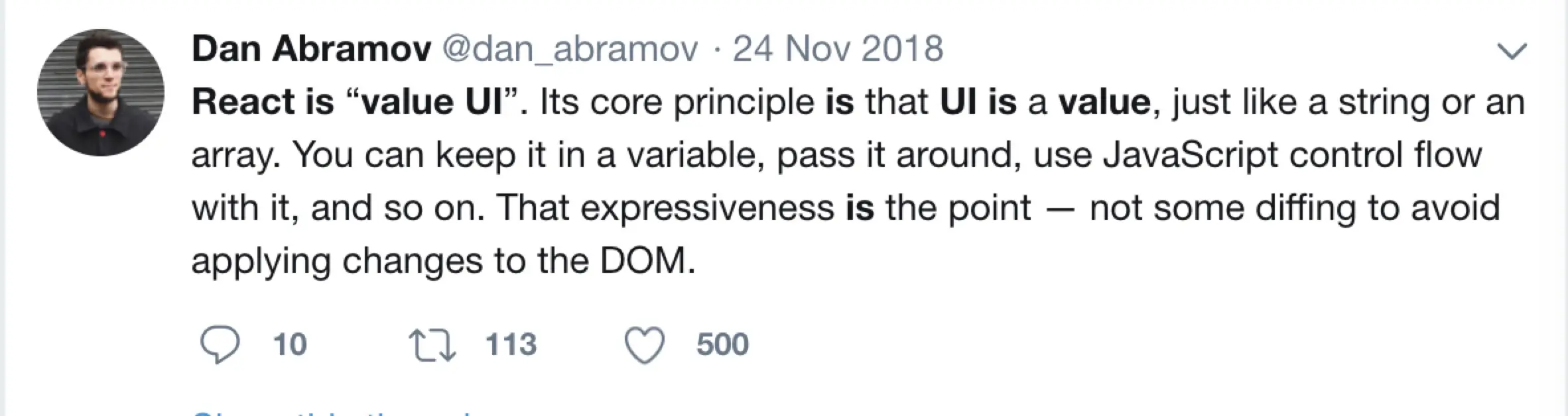 编译时解决方案,更加像一个增强的模版,只要你遵循相关约定和语法限制,从工程角度来说完全是可以构建出完整的应用的。但是站在更高的抽象上,React带来的本身就是对UI的重新思考, 无论是UI as code, 还是React is "value UI"。