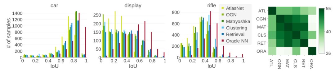 图 11:不同生成结果的 IoU。图源:M. Tatarchenko, S. R. Richter, R. Ranftl, Z. Li, V. Koltun, T. Brox. (2019). What Do Single-view 3D Reconstruction Networks Learn? arXiv:1905.03678v1.