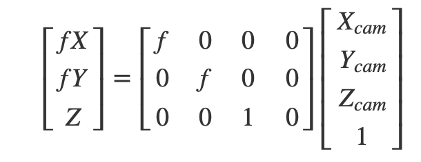 即点(X,Y,Z)在图像坐标系中对应的坐标是(fX/Z,fY/Z,f)。这个映射关系对坐标 Z 来讲是非线形的,我们需要通过扩展坐标维度对其线性化,从而进行矩阵运算: