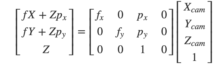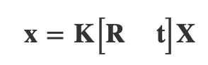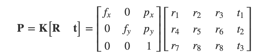 将相机内外参矩阵结合起来,我们就可以获得完整的物体从 3D 世界中被投射到 2D 图像中的坐标转换关系: