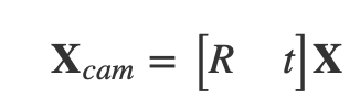 其中 X_cam 和 X 分别是一点在相机坐标系和世界坐标系下的坐标表示,R 为 3x3 的旋转矩阵,t 为 3x1 的平移向量。为了统一运算方式,我们将上式也改写为矩阵形式: