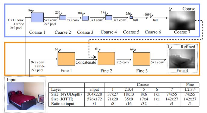 图 8:D. Eigen 等学者提出的神经网络模型结构。图源:D. Eigen, C. Puhrsch, and R. Fergus. (2014). Depth map prediction from a single image using a multi-scale deep network. NIPS.