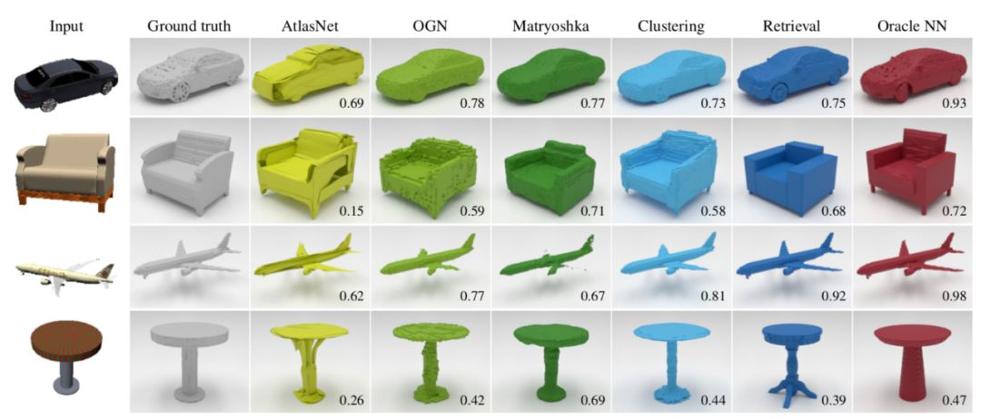 Maxim Tatarchenko 等学者 [10] 认为,实际上目前表现最好的深度学习算法实际上学习到的是图像分类,而非图像重建。他们设计了几个简单的基线算法,一个为 K-means 算法,将训练集中的形状聚类为 500 个子类别;一个 retrieval 算法将数据集中的形状投射到低维空间中求解和其他形状的相似度;还有一个最近邻算法(Oracle NN)根据 IoU,为测试集中的 3D 形状找到与训练集最接近的形状。这个方法不能在实践中应用,但可以给出检索方法应对这一任务所能取得的表现的上限。