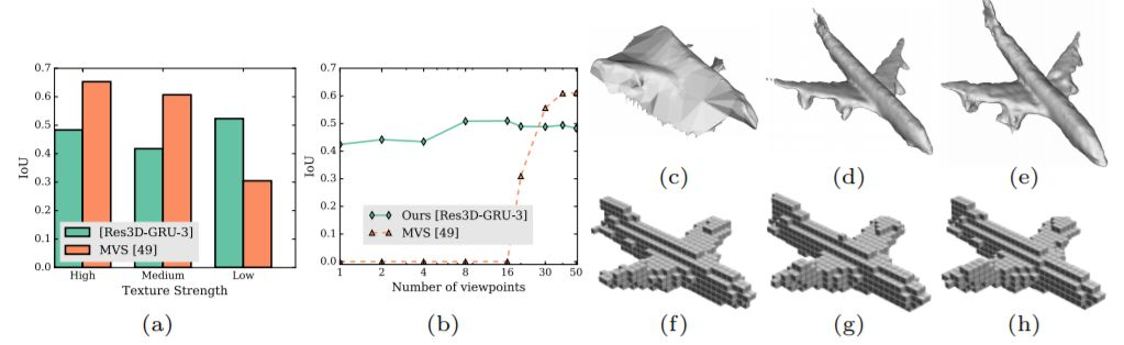 上图(c)到(h)则给出了分别给定 20,30 和 40 个视点的高纹理飞机模型时,3D-R2N2 和 Patch-Match 的表现。其中(c-e)是 Patch-Match 的重建结果,(f-h)是 3D-R2N2 的重建结果。可以看到 3D-R2N2 的预测的确差别不大,而 Patch-Match 则从完全无法辨认的预测提升到了流畅、精细的重建结果。