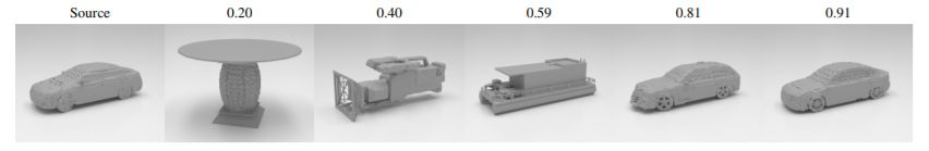针对第二个问题,目前深度学习使用的训练集主要是 ShapeNet 数据集。然而,该数据集的测试集中的形状与训练集中的形状非常相似。以 ShapeNet 为数据集训练出的重建模型可以很轻易的找到捷径——它只需要从训练集中检索类似的形状。在 Maxim Tatarchenko 等学者的研究中我们也看到了这一现象。
