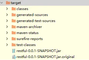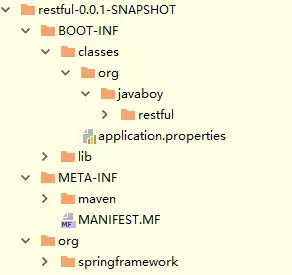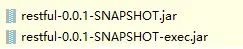 这里有两个文件,第一个 restful-0.0.1-SNAPSHOT.jar 表示打包成的可执行 jar ,第二个 restful-0.0.1-SNAPSHOT.jar.original 则是在打包过程中 ,被重命名的 jar,这是一个不可执行 jar,但是可以被其他项目依赖的 jar。通过对这两个文件的解压,我们可以看出这两者之间的差异。