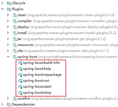 这我们就不得不提 Spring Boot 项目中一个默认的插件配置 spring-boot-maven-plugin ,这个打包插件存在 5 个方面的功能,从插件命令就可以看出: