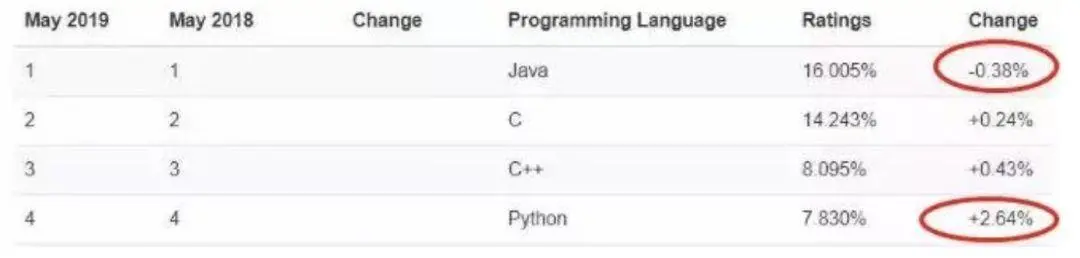 目前,市面上大部分人工智能的代码,其技术底层代码是C或C++,而顶层技术则由Python来编写。数据显示,在TIOBE公布了2019年5月编程语言排行榜中,可以非常清晰地看到,C语言占比14.243%,C++占比8.095%,Python占比7.830%,比例均有上升。