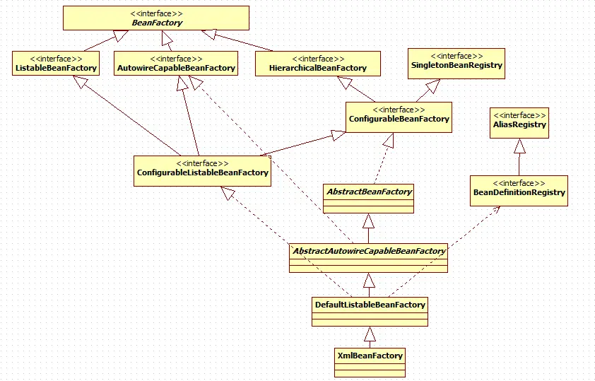 实际上进经过多年的发展,Spring Core 的BeanFactory这块已经发生了多次改变。从最基础的BeanFactory到ConfigurableListableBeanFactory层层向下推进全是接口或抽象类,每一个接口都在父接口的基础上包装了的新的接口方法。通过多层继承,官方的代码中只有一个名为DefaultListableBeanFactory的类将所有的接口功能都实现了,然后XmlFactory又继承实现了资源读写的功能。XmlFactory并没有多少代码,Ioc的核心功能都在DefaultListableBeanFactory。