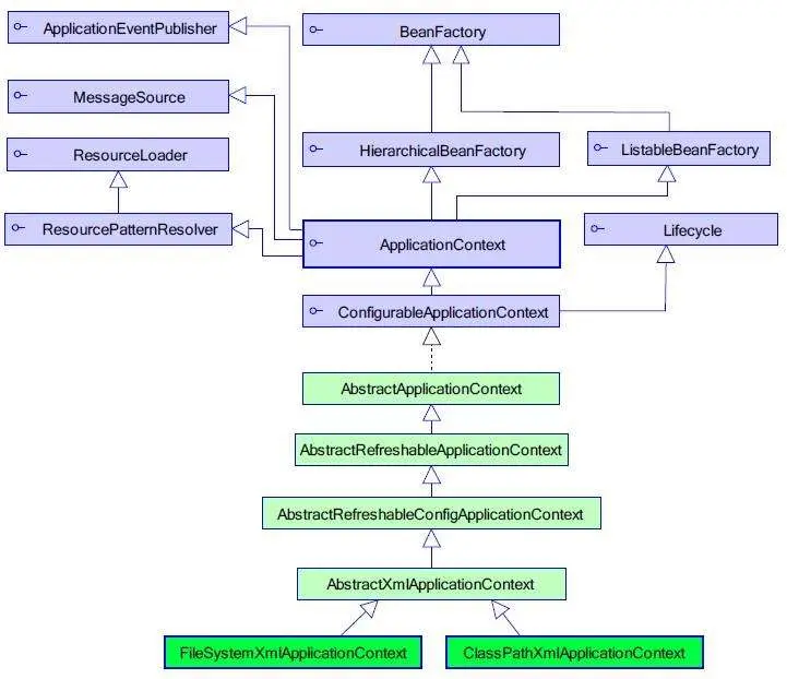 ApplictionContext的继承思路和BeanFactory类似,就不再介绍了。在核心包中,Spring提供的ApplicationContext实现类目前有FileSystemXmlApplication和ClassPathXmlApplicationContext(Web包里还有Web环境专用的ApplicationContext)。