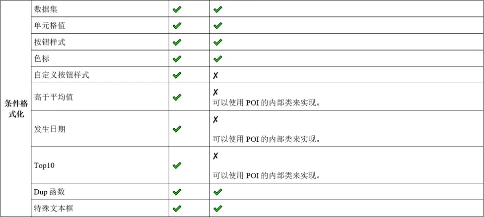 GcExcel支持更多条件格式规则,如自定义图标集、高于平均值(AboveAverage)、发生日期、Top 10和重复项,且这些条件格式规则与VSTO保持一致。但在Apache POI中,使用高级API支持条件格式会受到限制,例如,需要使用标记为内部用途的低级类来处理Top10、高于平均值(AboveAverage)等格式化。