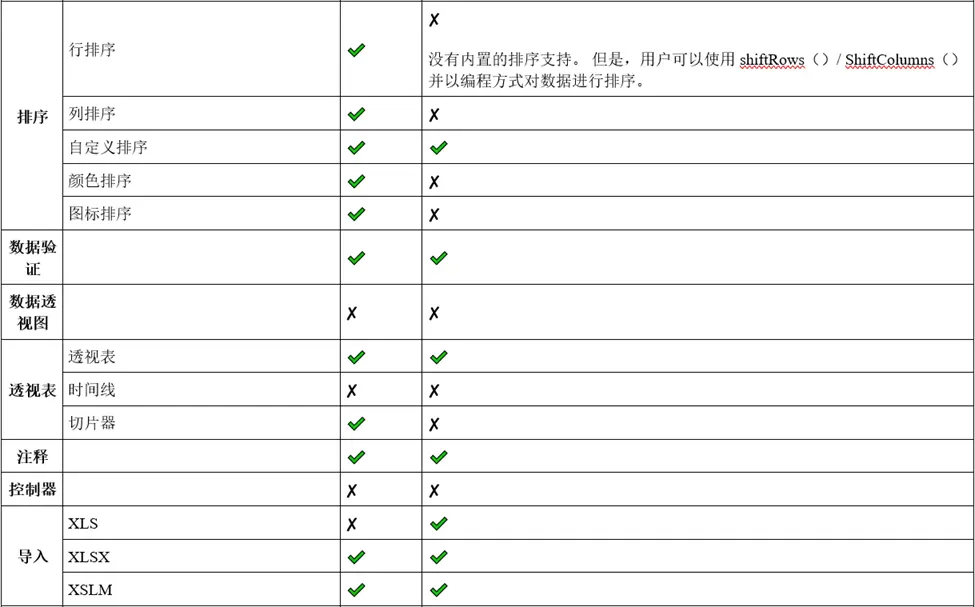 GcExcel支持所有类型的行排序、列排序、自定义排序、颜色和图标排序。 Apache POI没有内置的排序支持。但是,用户可以使用shiftRows()/ ShiftColumns()并以编程方式对数据进行排序。
