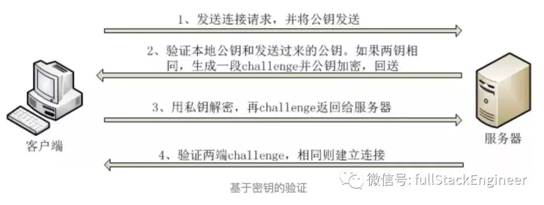 当客户端SSH连接服务器时,客户端携带着公钥向服务器发出链接请求,远端服务器收到请求后,在 ~/.ssh/authorized_keys信任文件里比对该公钥是否存在,如果对比成功,远端服务器则使用该公钥加密一个随机字符串(challenge),然后发送给客户端。客户端接收到该服务器回来的请求后,将随机字符串(challenge)用自己的私钥进行解密,之后再将解密后的结果传给远端服务器,远端服务器对比传来的字符串是否一致,一致则建立连接。