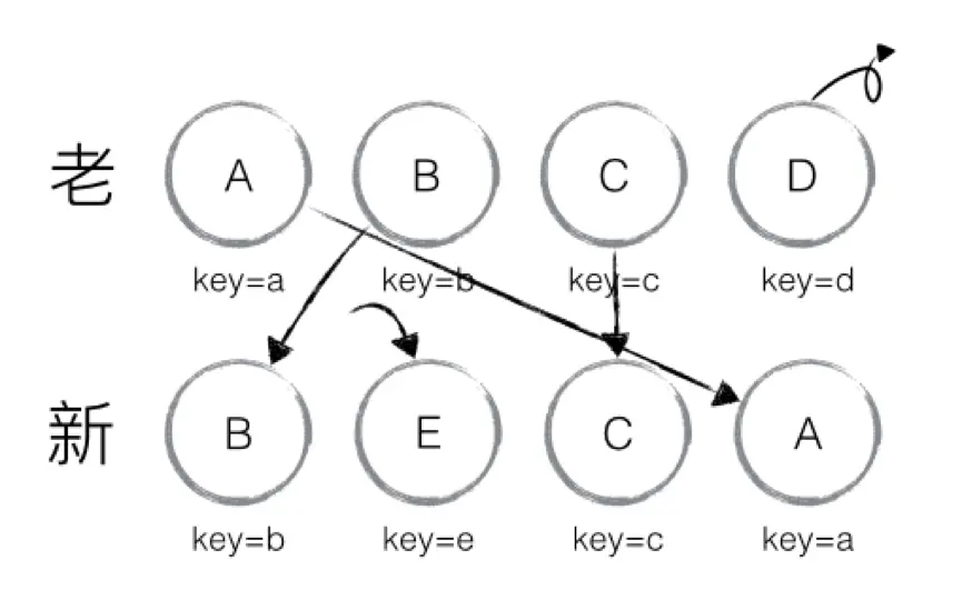 分层比较,两棵树只会针对同一层级的DOM节点进行比较,即同一父节点下的所有子节点。如果发现节点A已经不存在时,则对应的删除该节点及其所有子节点