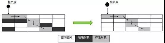 - 2.标记-整理算法:分为两阶段“标记”和“整理”。首先标记出哪些对象可被回收,在标记完成后,将对象向一端移动,然后直接清理掉边界以外的内存。