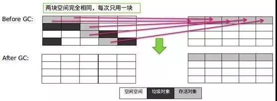 - 3.复制算法:把内存空间划为两个相等的区域,每次只使用其中一个区域。gc时遍历当前使用区域,把正在使用中的对象复制到另外一个区域中。算法每次只处理正在使用中的对象,因此复制成本比较小,同时复制过去以后还能进行相应的内存整理,不会出现“碎片”问题。不足之处: