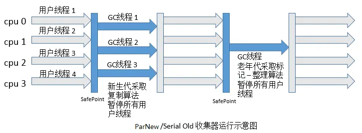 多线程。使用多线程进行垃圾收集。应用场景: 它是Server模式下的虚拟机首选的新生代收集器。但在单个CPU环境中,不会比Serail收集器有更好的效果,因为存在线程交互的开销。 ParNew/Serial Old收集器运行示意图: -