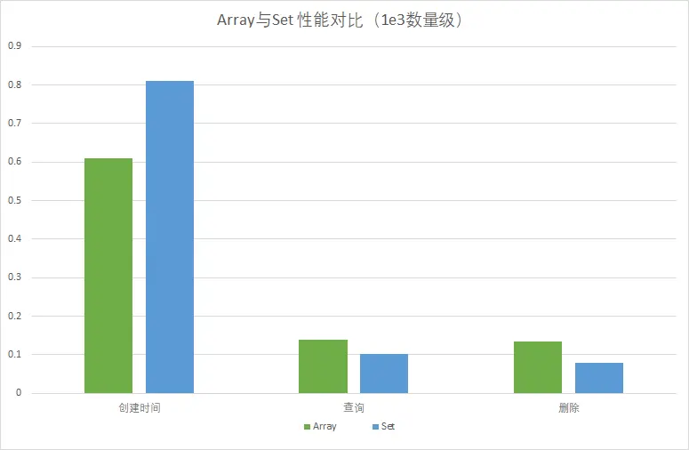 Array占优势之外其他两种情况都是Set远超Array,但是别忘了我们上面的数据量是多少?1e7! 这是一个平时代码中几乎接触不到的数据量,哪怕是在Node里我也想象不到什么场景下需要我们手动在内存里操作一个1e7数量级的Array,更别说浏览器的环境下了。一般在客户端下我们的操作的数据不会超过1e3,单个页面上千的数据映射到DOM上已经非常卡了,更别说更高的数量级了。下面我们看一下1e3级别的性能对比,可以看到全部都是1MS都不到的数据,小数据下使用时根本不用考虑两者性能的开支,你多操作一次DOM造成的性能开始都比你操作数据的开支要多的多了。所以日常开发中在适合的场景使用适合的工具,有时你考虑的性能在整个环节中根本就是微不足道的