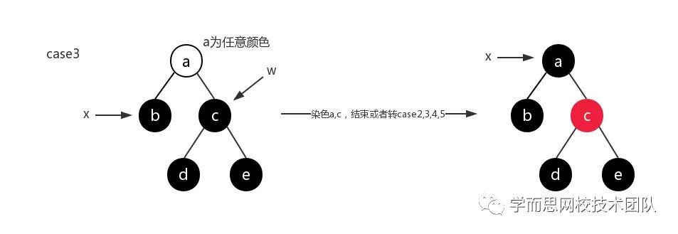删除结点的兄弟结点及其孩子全部都是黑色的,调整措施为:将删除结点的兄弟结点设为红色,同时设置删除结点的父结点标记为新的结点,继续判断;如下图所示: