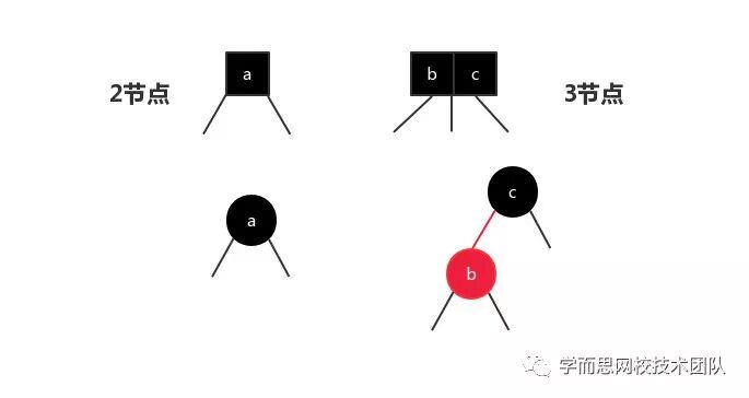 如图所示:对于二节点来说很简单,一个黑色节点代表二节点。复杂的是三节点,我们用两个节点来表示三节点,