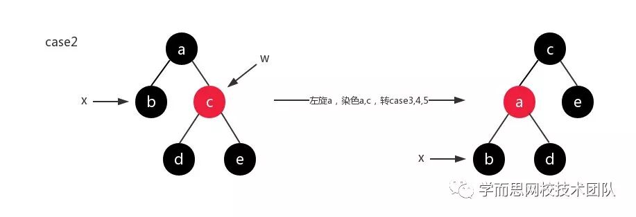 删除结点的兄弟结点是黑色,其左孩子是红色,右孩子是黑色。调整措施为:将兄弟结点设为红色,兄弟结点的左孩子结点设为黑色,以兄弟结点为准进行右旋操作,最终更新删除结点的兄弟结点;如下图所示: