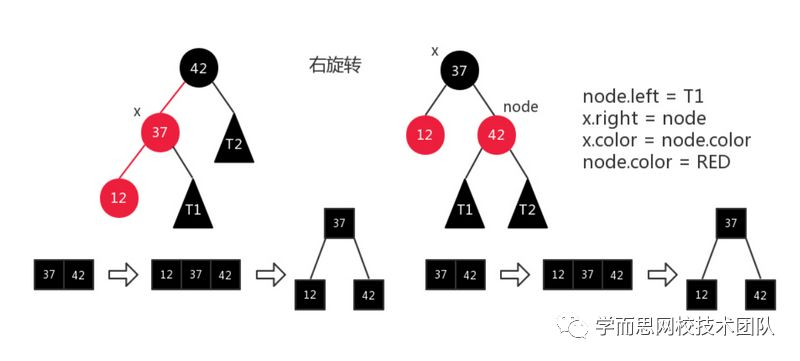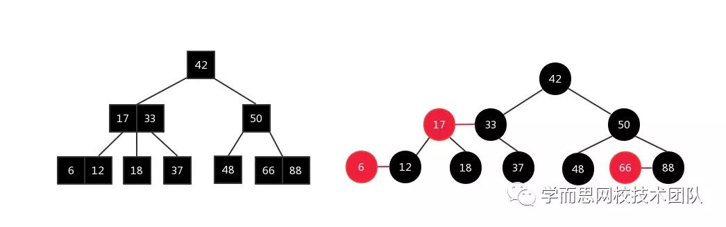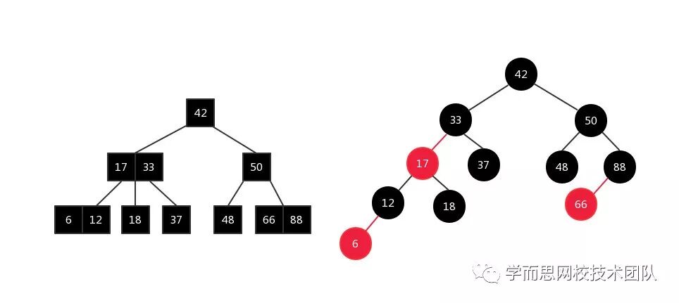 如果仍觉得抽象,请看下面右图。相信大家已经明白了2-3树与红黑树的等价关系。