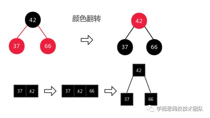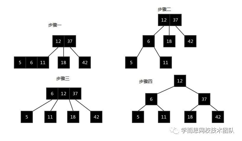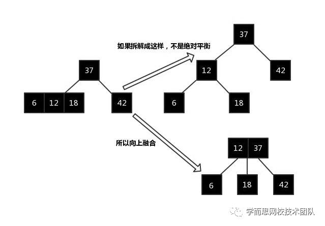 如果一个叶子节点本身就是3节点,添加一个变成了四节点,向下拆解时,不是一颗绝对平衡的2-3树。所以向上融合,12与37直接融合变成一个3节点。