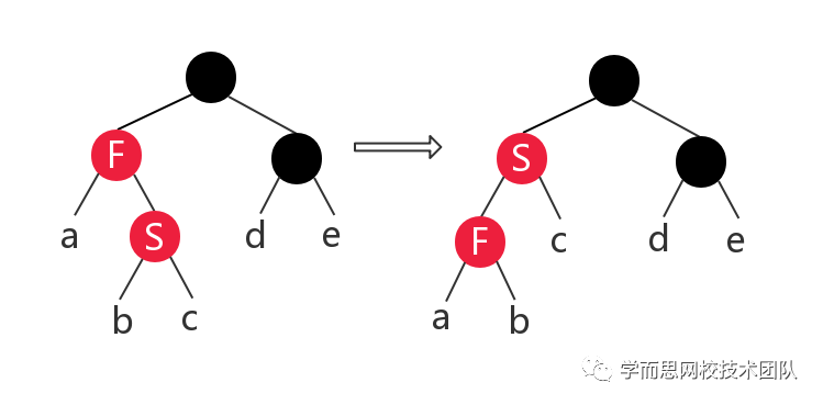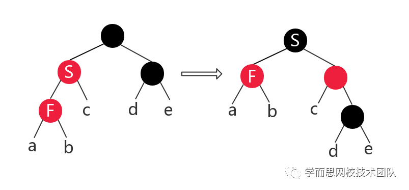 分析:在此种情况下,由于当前结点 F 和父结点 S 颜色都为红色,违背了红黑树的性质 4,此时可以将 S 颜色改为黑色,有违反了性质 5,因为所有通过 S 的路径其黑高度都增加了 1 ,所以需要将其祖父结点颜色设为红色后紧接一个右旋,这样这部分子树有成为了红黑树。(上图中的有图虽看似不是红黑树,但是只是整棵树的一部分,以 S 为根结点的子树一定是一棵红黑树)