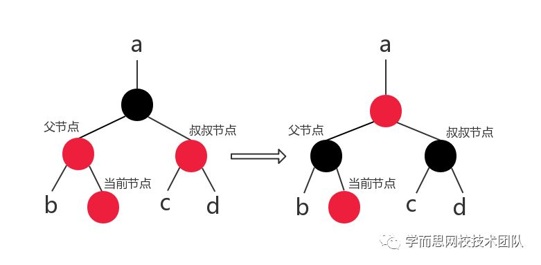 分析:此种情况下,由于父结点和当前结点颜色都是红色,所以为了不产生冲突,将父结点的颜色改为黑色。但是虽避免了破坏第 4 条,但是却导致该条路径上的黑高度增加了 1 ,破坏了第 5 条性质。但是在将祖父结点颜色改为红色、叔叔结点颜色改为黑色后,该部分子树没有破坏第 5 条性质。但是由于将祖父结点的颜色改变,还需判断是否破坏了上层树的结构,所以需要将祖父结点看做当前结点,继续判断。