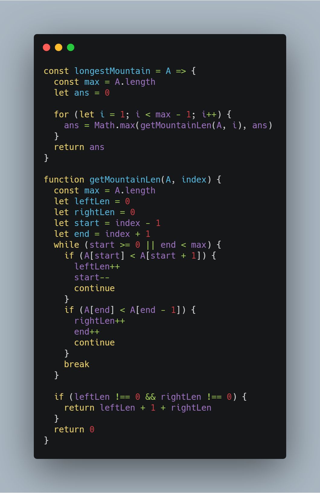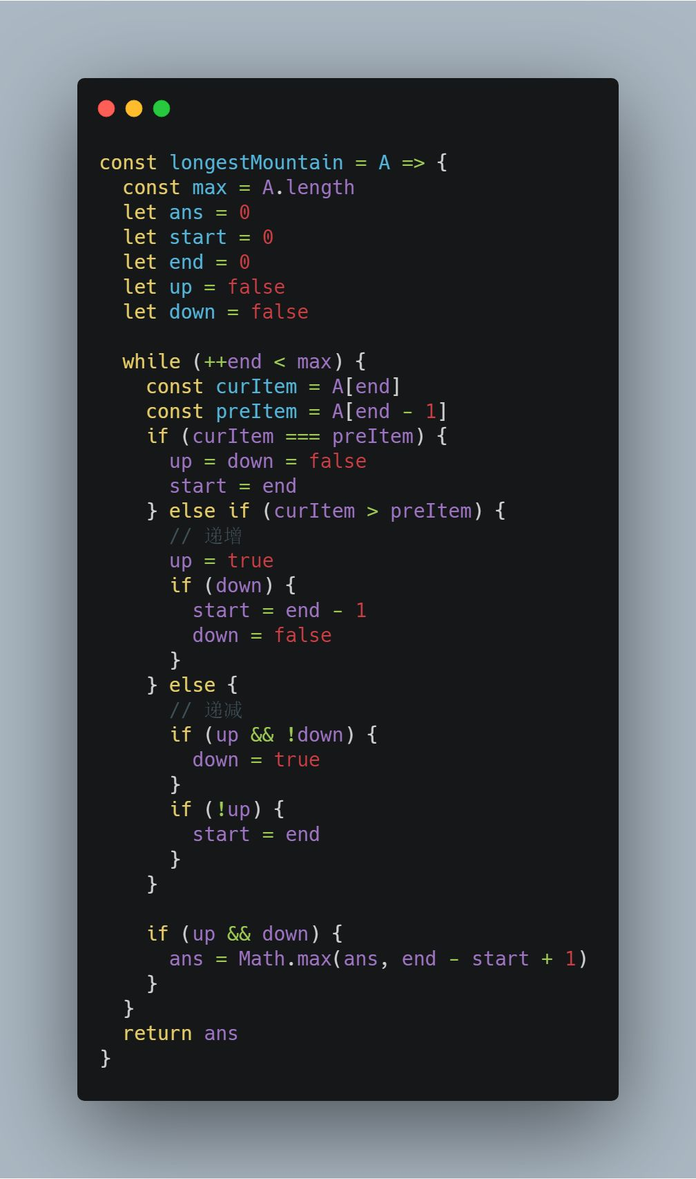 朴素解法的思路:依次以数组中的元素为“峰顶”,如果满足“山脉”的条件,那么统计长度。