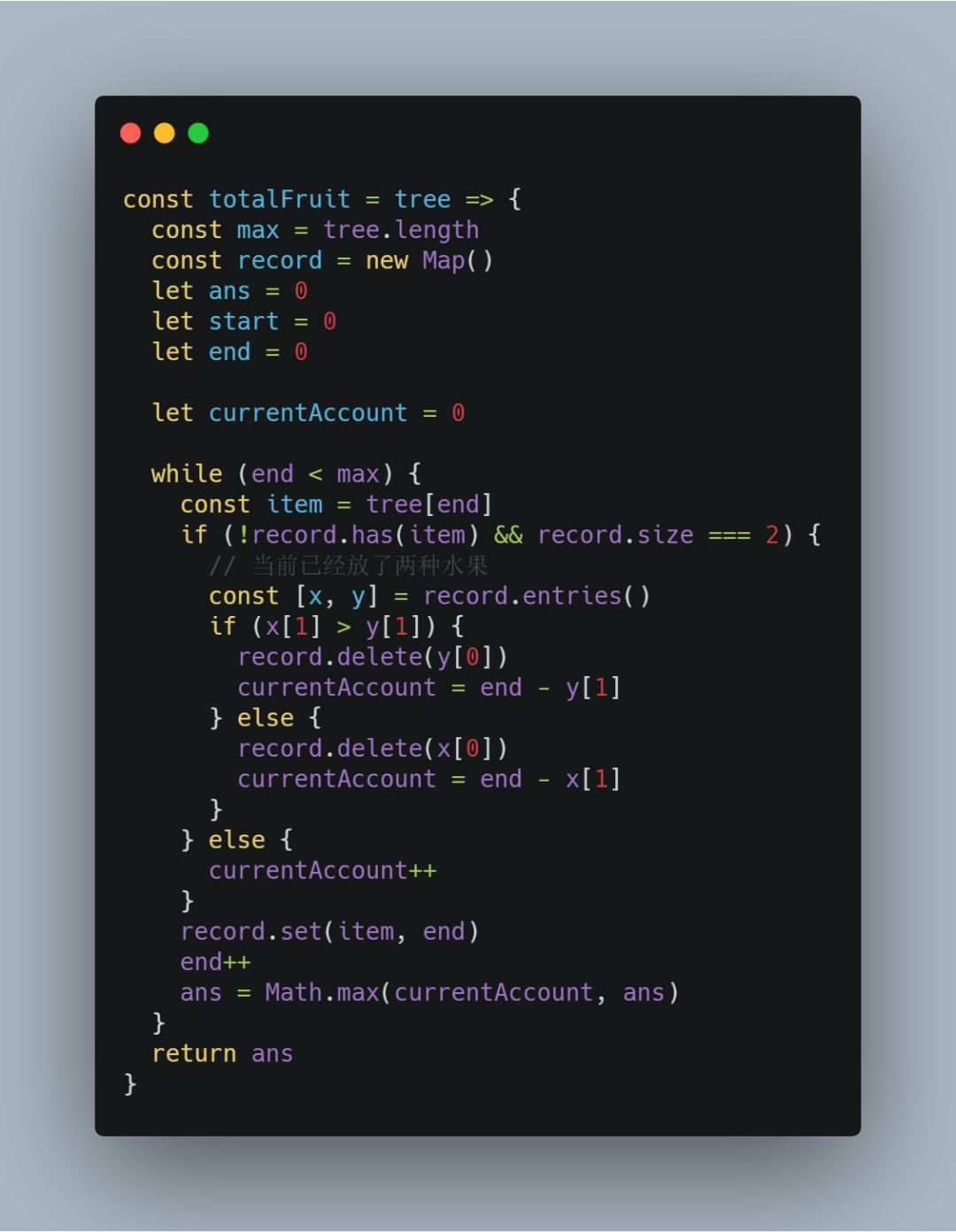 这道题很明显符合滑动窗口算法的特征:维护一个至多有两种水果的窗口。