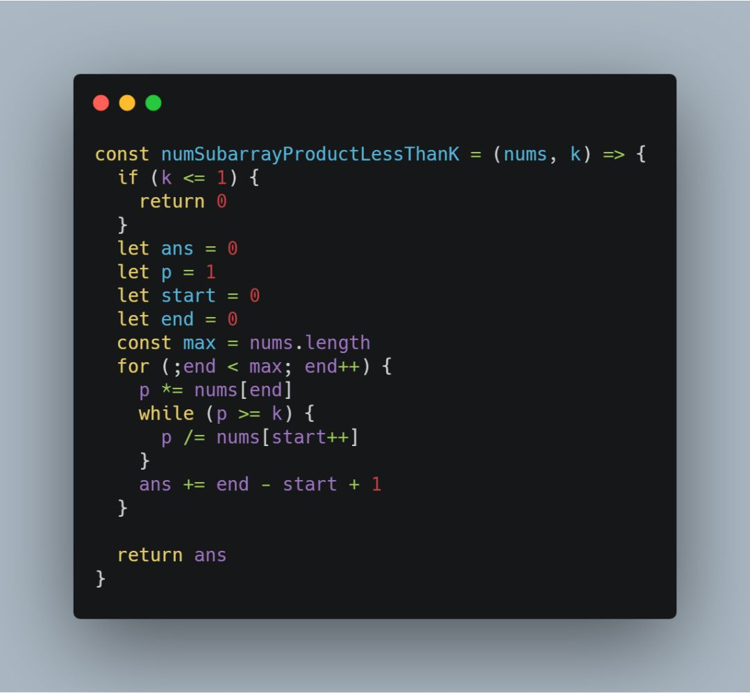 本题需要维护一个乘积小于 k 的窗口,与上述题目相比,本题不需要太多技巧去计算有效的窗口值,它的难点在于满足乘积的数组的长度正好是当前不重复子数组的数量。