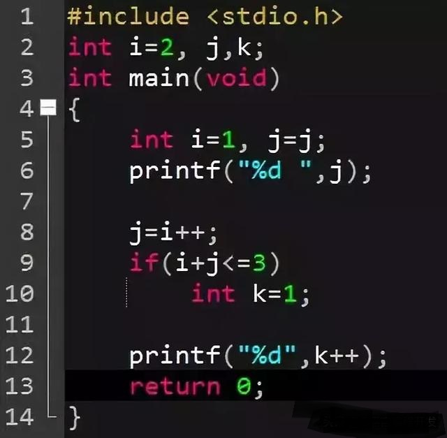 解析:main函数中重新声明变量i和j,j的值未初始化,因此用j给本身赋值结果未定义,而if语句中声明k变量,此时k变量的作用域仅到if语句结束,因此,如果开始没有声明全局变量k,编译将不通过,错误原因是k未声明,而此程序开始就声明了全局变量k,后面k默认为全局变量,全局变量未初始化则默认初始化为0,所以k++打印的是0,但k变为1。