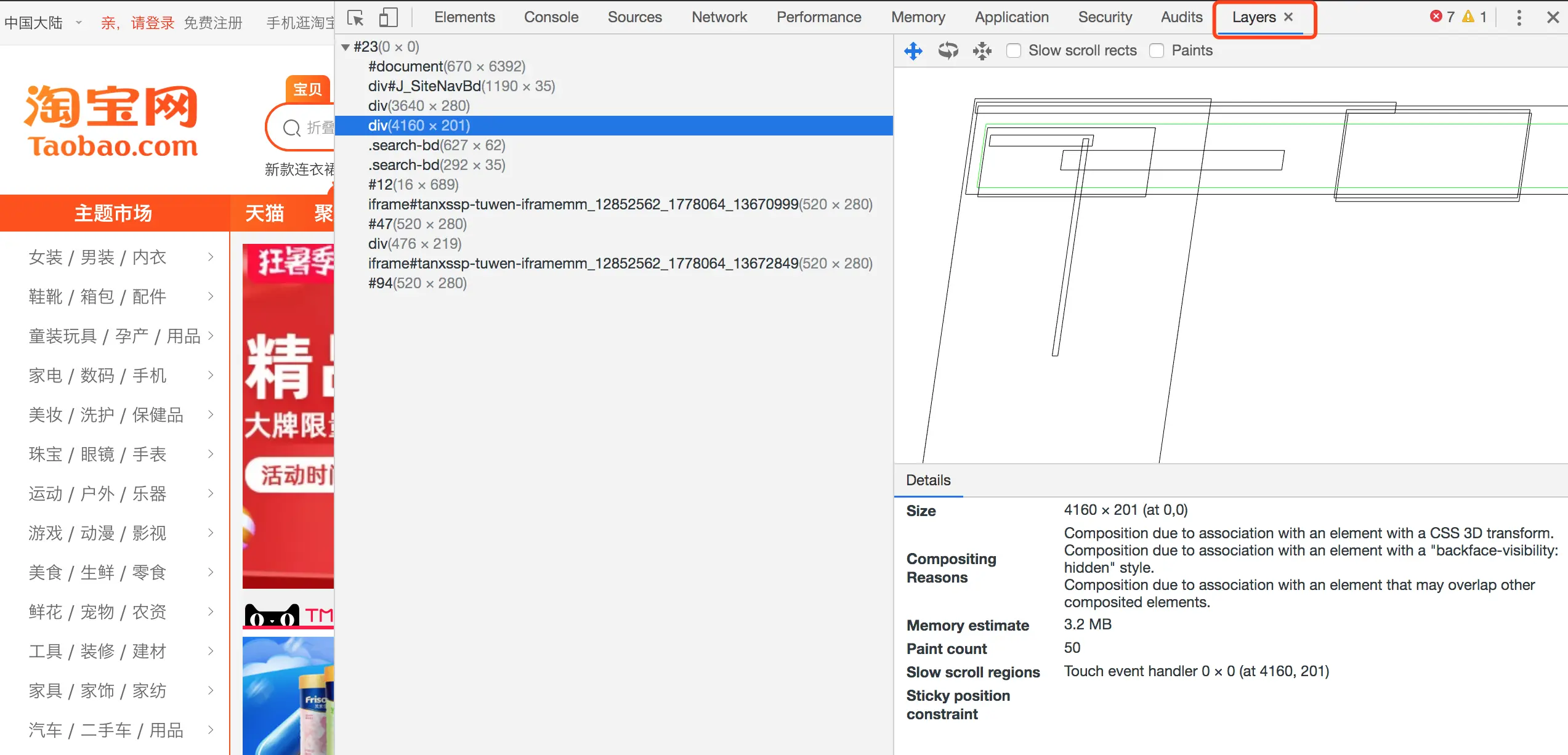 可以通过Chrome开发者工具中的Layer来查看合成层: