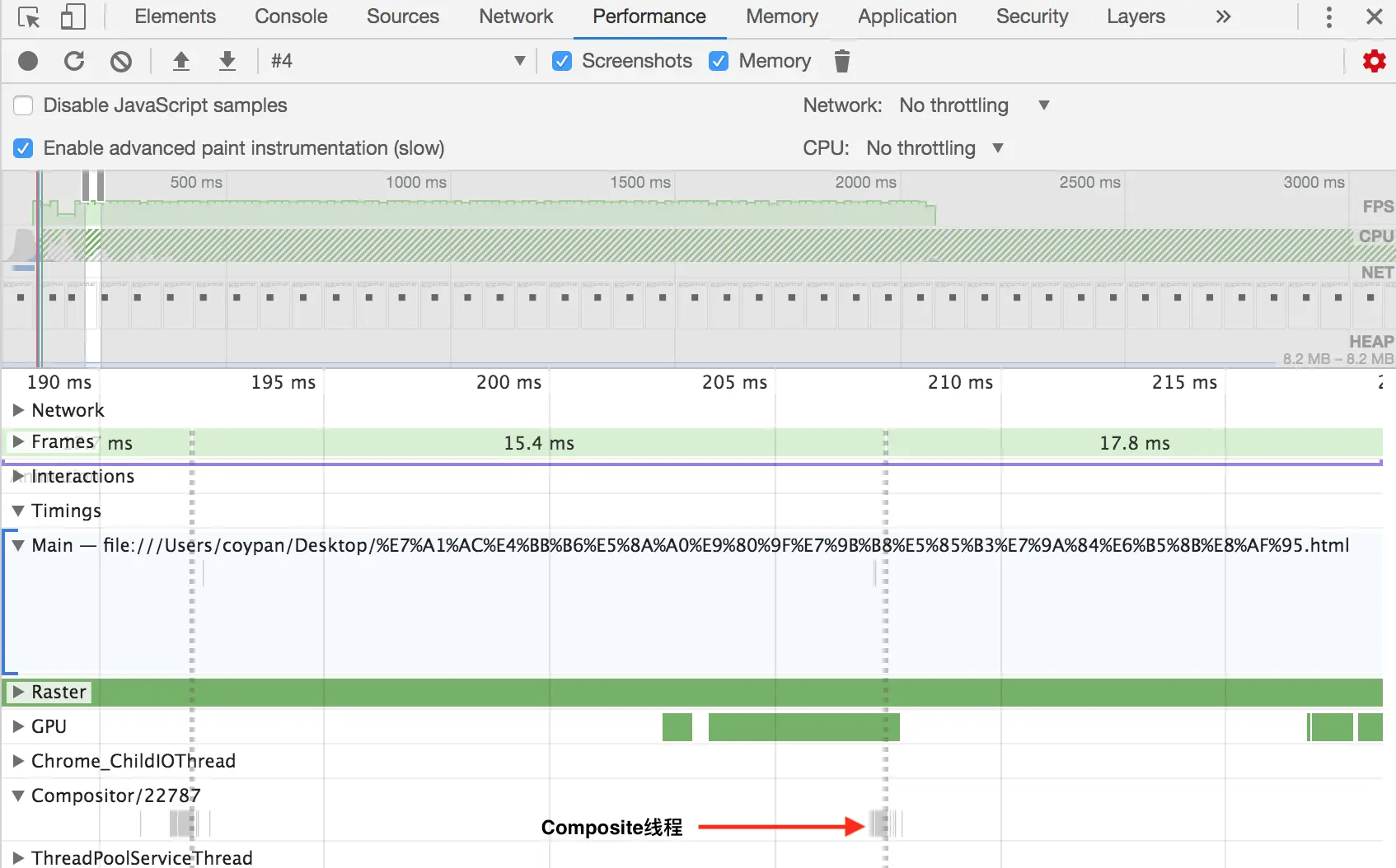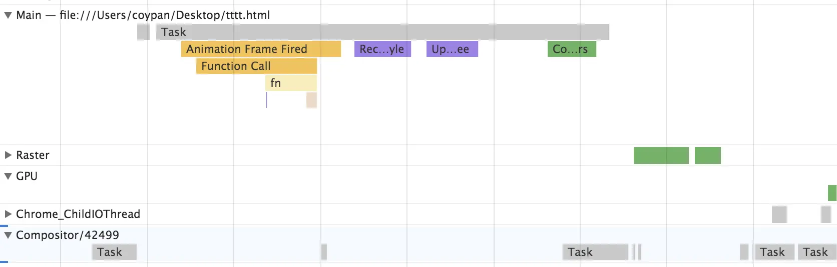 可以看到,主线程里没有任务在执行,而Composite线程、Raster线程以及GPU在工作。