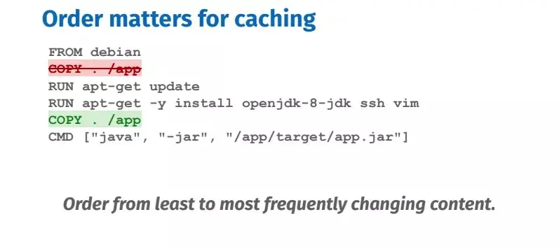镜像的构建顺序很重要,当你向 Dockerfile 中添加文件,或者修改其中的某一行时,那一部分的缓存就会失效,该缓存的后续步骤都会中断,需要重新构建。所以优化缓存的最佳方法是把不需要经常更改的行放到最前面,更改最频繁的行放到最后面。