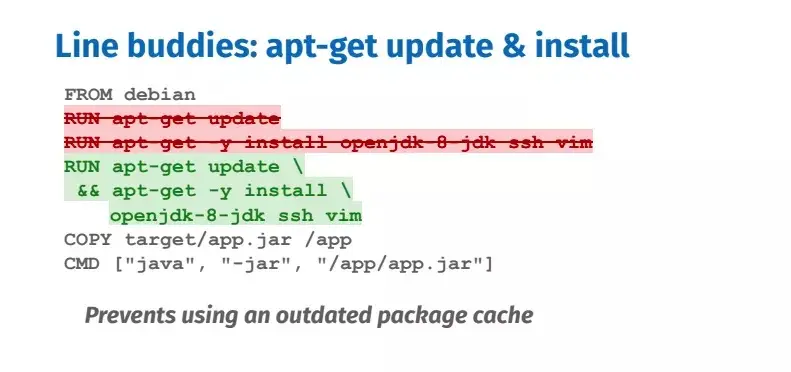 每一个 RUN 指令都会被看作是可缓存的执行单元。太多的 RUN 指令会增加镜像的层数,增大镜像体积,而将所有的命令都放到同一个 RUN 指令中又会破坏缓存,从而延缓开发周期。当使用包管理器安装软件时,一般都会先更新软件索引信息,然后再安装软件。推荐将更新索引和安装软件放在同一个 RUN 指令中,这样可以形成一个可缓存的执行单元,否则你可能会安装旧的软件包。