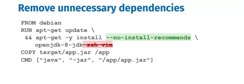 删除不必要的依赖,不要安装调试工具。如果实在需要调试工具,可以在容器运行之后再安装。某些包管理工具(如 apt)除了安装用户指定的包之外,还会安装推荐的包,这会无缘无故增加镜像的体积。apt 可以通过添加参数 -–no-install-recommends 来确保不会安装不需要的依赖项。如果确实需要某些依赖项,请在后面手动添加。