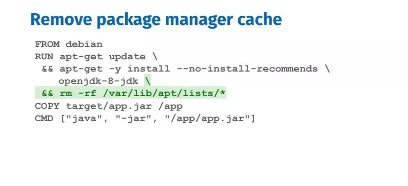 包管理工具会维护自己的缓存,这些缓存会保留在镜像文件中,推荐的处理方法是在每一个 RUN 指令的末尾删除缓存。如果你在下一条指令中删除缓存,不会减小镜像的体积。