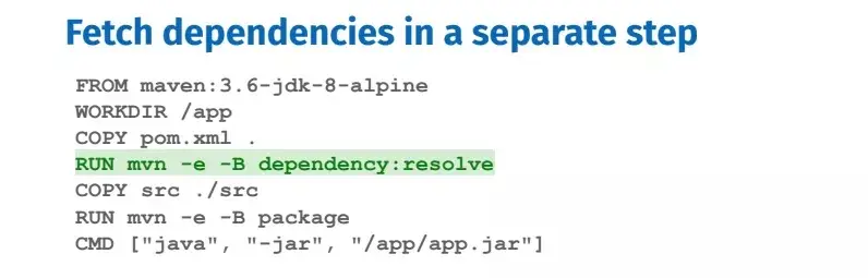 结合前面提到的缓存机制,我们可以让获取依赖项这一步变成可缓存单元,只要 pom.xml 文件的内容没有变化,无论代码如何更改,都不会破坏这一层的缓存。上图中两个 COPY 指令中间的 RUN 指令用来告诉 Maven 只获取依赖项。