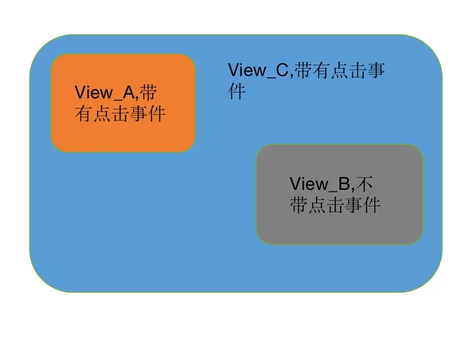 如上图,有这么一组布局,当我们点击 View_A 触发的是 View_A 的点击事件,而重叠的 View_C 的点击事件并不会被触发。当我们点击 View_B 时,触发的重叠的 View_C 的点击事件。