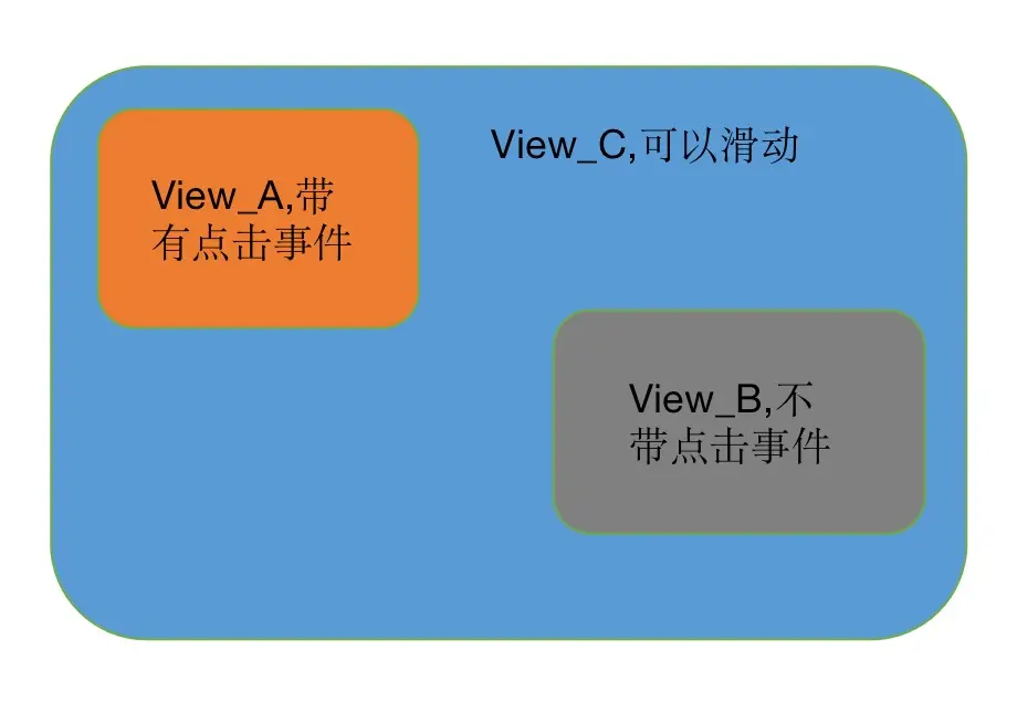 如上图,有这么一组布局,当我们点击 View_A 触发的是 View_A 的点击事件,在 View_A 或 View_C 上面移动我们的手指,触发的是 View_C 滑动事件。把手指放在 View_A 上的一瞬间,会触发 View_A 的 ACTION_DOWN 方法,但是我们开始移动手指,因为没有提起手指,所以不会触发 View_A 的点击事件,此时 View_C 中的 onInterceptTouchEvent 方法发现我们的手指在移动,所以会拦截接下来的触摸事件,并且给 View_A 发送一个 ACTION_CANCEL 的事件, View_A 接收到 ACTION_CANCEL 会恢复原样(在 ACTION_DOWN 的时候可能会改变了当前的状态)。
