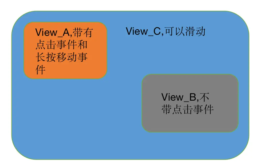 如上图所示,此时 View_A 不仅有点击事件,而且还能长按移动位置,并且 View_C 可以滑动。这时需要保证长按移动位置的过程不触发 View_C 的滑动事件就要调用父 View 的 public void requestDisallowInterceptTouchEvent(boolean disallowIntercept) 禁止 View_C 在长按移动的时候拦截触摸事件。