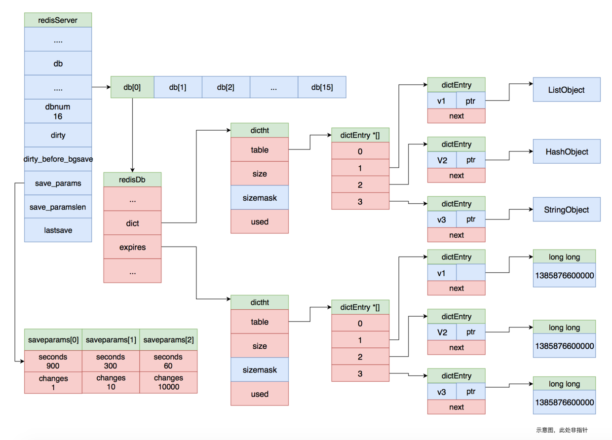 如上图所示,redisServer 结构体的save_params指向拥有三个值的数组,该数组的值与 redis.conf 文件中 save 配置项一一对应。分别是 save 900 1、save 300 10 和 save 60 10000。dirty 记录着有多少键值发生变化,lastsave记录着上次 RDB 持久化的时间。
