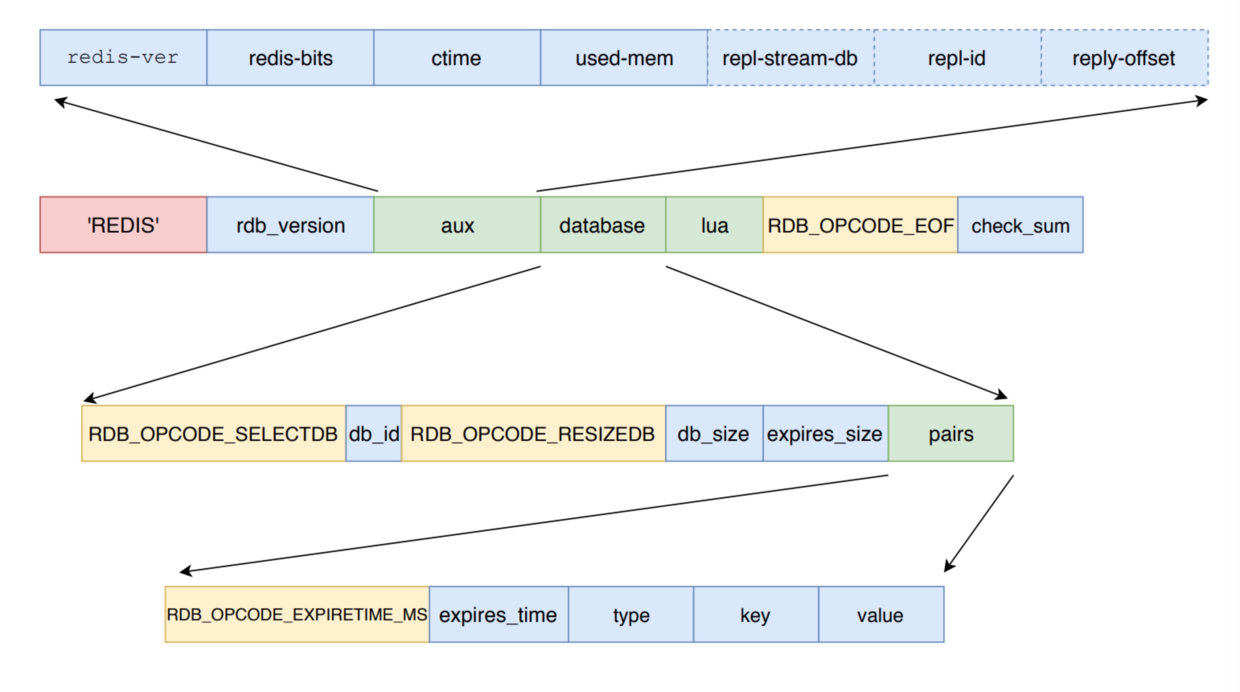 先写入 REDIS 魔法值,然后是 RDB 文件的版本( rdb_version ),额外辅助信息 ( aux )。辅助信息中包含了 Redis 的版本,内存占用和复制库( repl-id )和偏移量( repl-offset )等。
