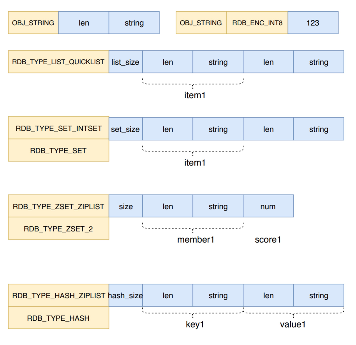 不同的数据结构进行 RDB 持久化的格式都不同。我们今天只看一下集合对象是如何持久化的。