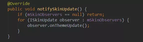 这里很简单,就是去遍历mSkinObservers这个集合,然后去通知更新。对于ISkinUpdate是一个接口,每个需要皮肤更新的Activity都需要去实现这个接口。