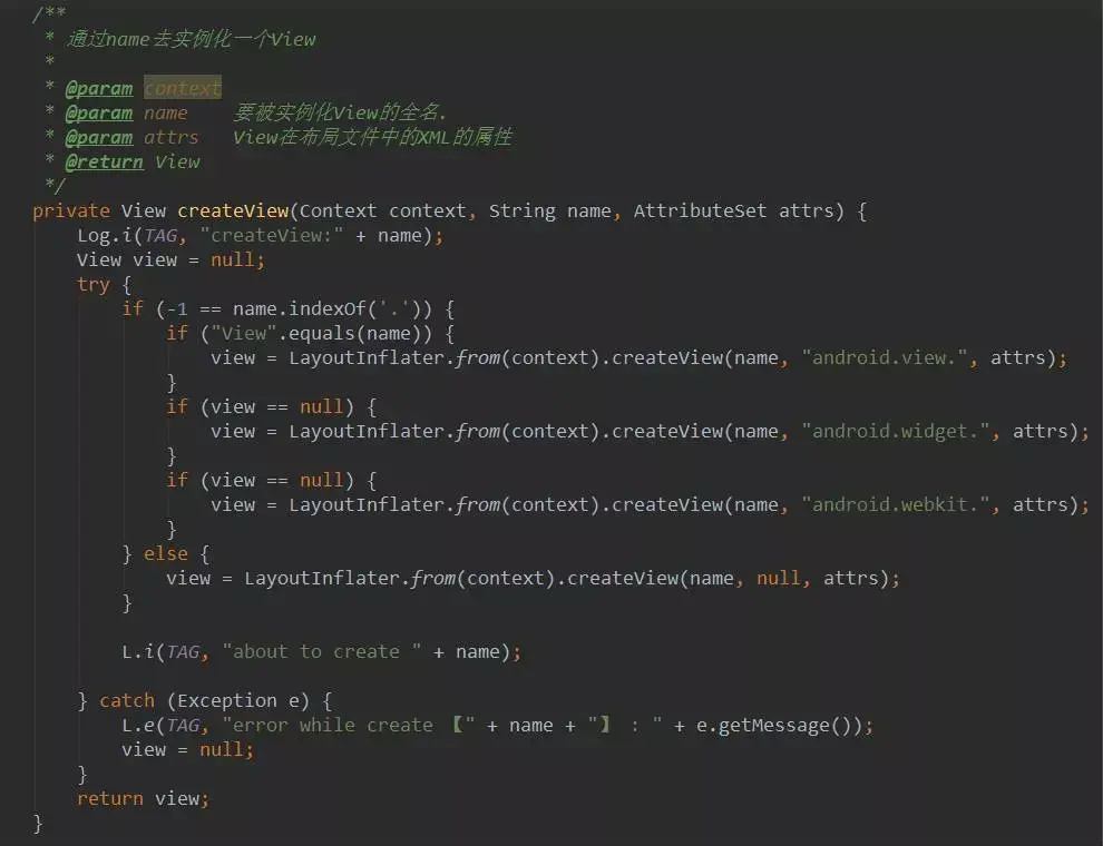 对于LayoutInflater大家可能都不太陌生,当你需要把xml文件转化成对应View的时候就必须用到它,我想对于他怎么使用的就不用我介绍了。LayoutInflater 提供了setFactory(LayoutInflater.Factory factory)和setFactory2(LayoutInflater.Factory2 factory)两个方法可以让你去自定义布局的填充(有点类似于过滤器,我们在填充这个View之前可以做一些额外的事,但不完全是),Factory2 是在API 11才添加的。 他们提供了下面的方法让你去重写。在这里面你完全可以自己去定义去创建你所想要的View,如果在你在重写的方法中返回null的话,就会以系统默认的方式去创建View。