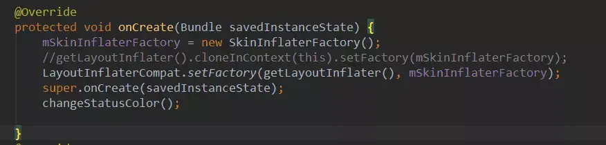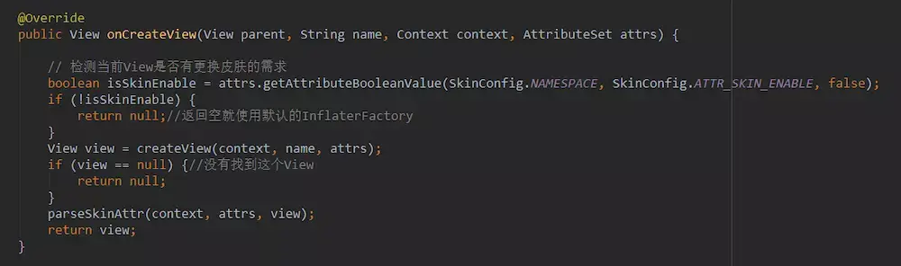 我们再来看看SkinInflaterFactory,在这里面主要就是做一些填充View相关的一些工作。我实现的是LayoutInflaterFactory这个接口而不是文章之前提到的LayoutInflater.Factory这个接口是因为这里需要与AppCompatActivity兼容,如果你还是用之前的那个就会出现一些错误,反正我刚弄的时候是折腾了很久的。不管怎么样原理始终是一样的。SkinInflaterFactory的作用就是去搜集那些有需要响应皮肤更改的View。 我们来看看onCreateView的实现