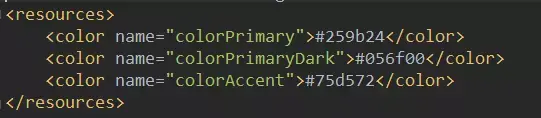 在使用的时候一定要记得要Activity要去继承于SkinBaseActivity,Fragment要继承于SkinBaseFragment,Application要继承于SkinBaseApplication。当然把这个框架做为你的项目依赖项肯定是必不可少的。为了Demo的简单,这里我只使用了下面三个颜色作为可以换肤的资源,当然如果你想要使用drawable文件也是可以办到的,前提是你一定要把这个Demo看懂。